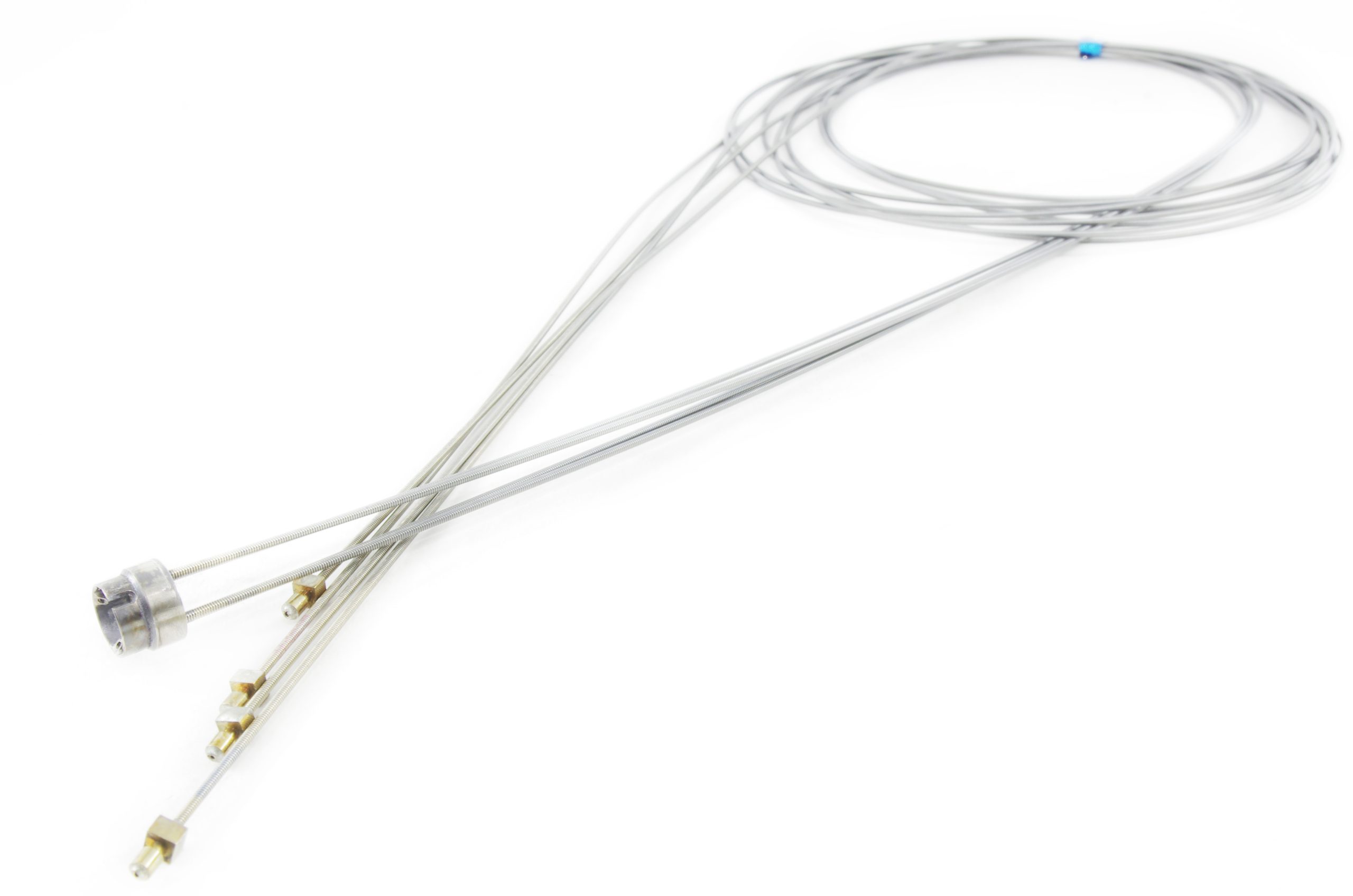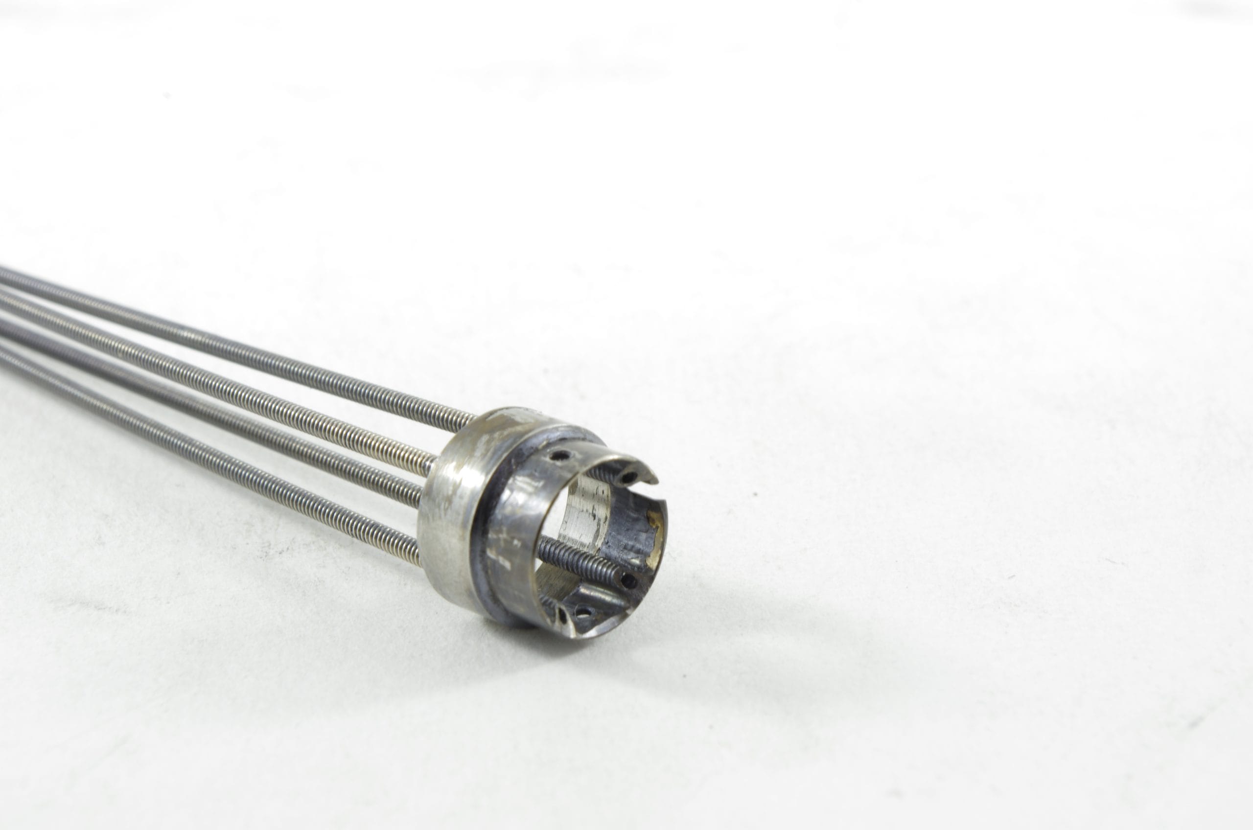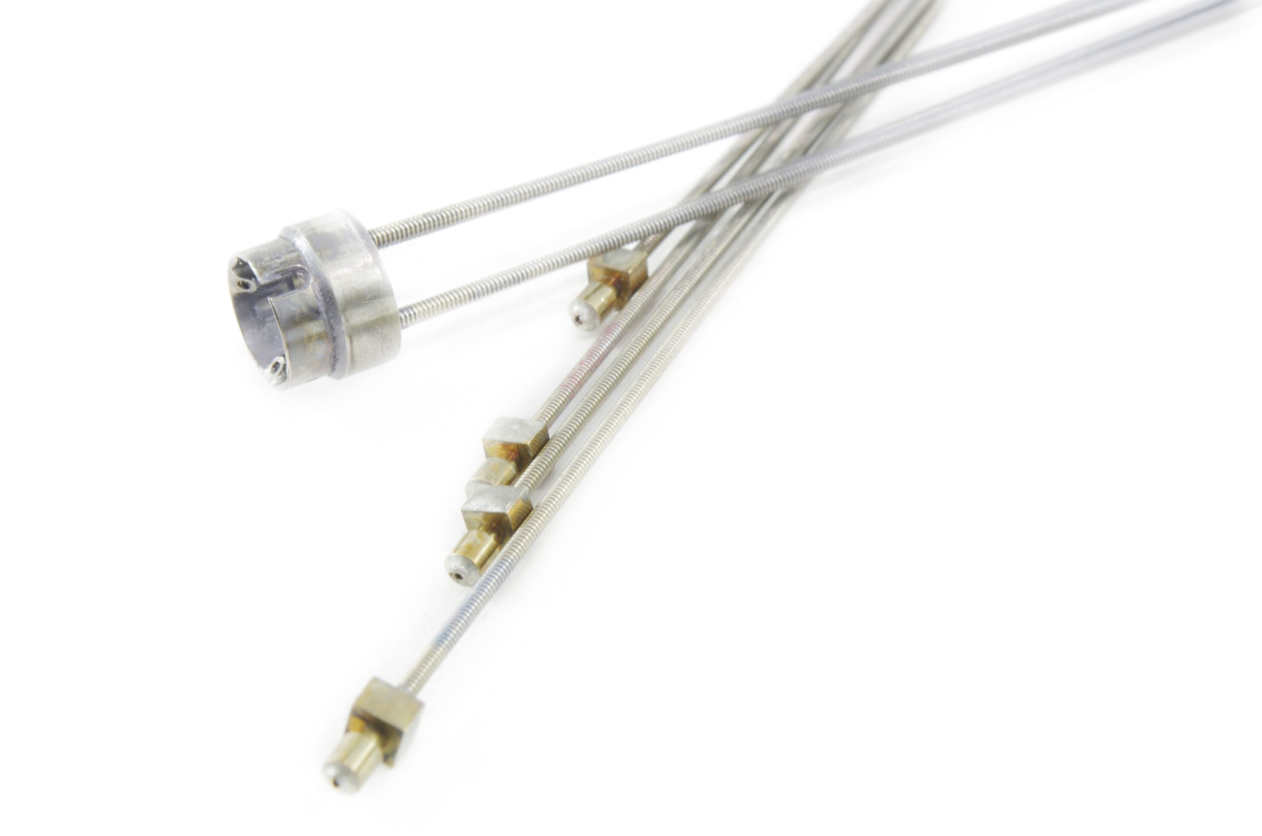 Comes with coil pipe fitting, coil pipes, and stoppers. This part is soldered at the distal end of the insertion tube. This part guides the angulation wires through the insertion tube to the angulation control mechanism in the Upper Control Body Assembly. Includes Coil Pipe Fitting and Coil Pipes.