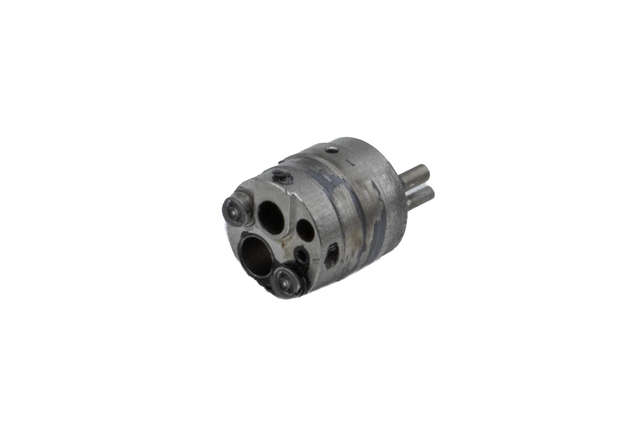 Large Diameter Distal Tip Assembly. This part includes a good metal Distal Tip and all good Light Guide Lenses. One Screw Holes is further away from the Biopsy Channel.