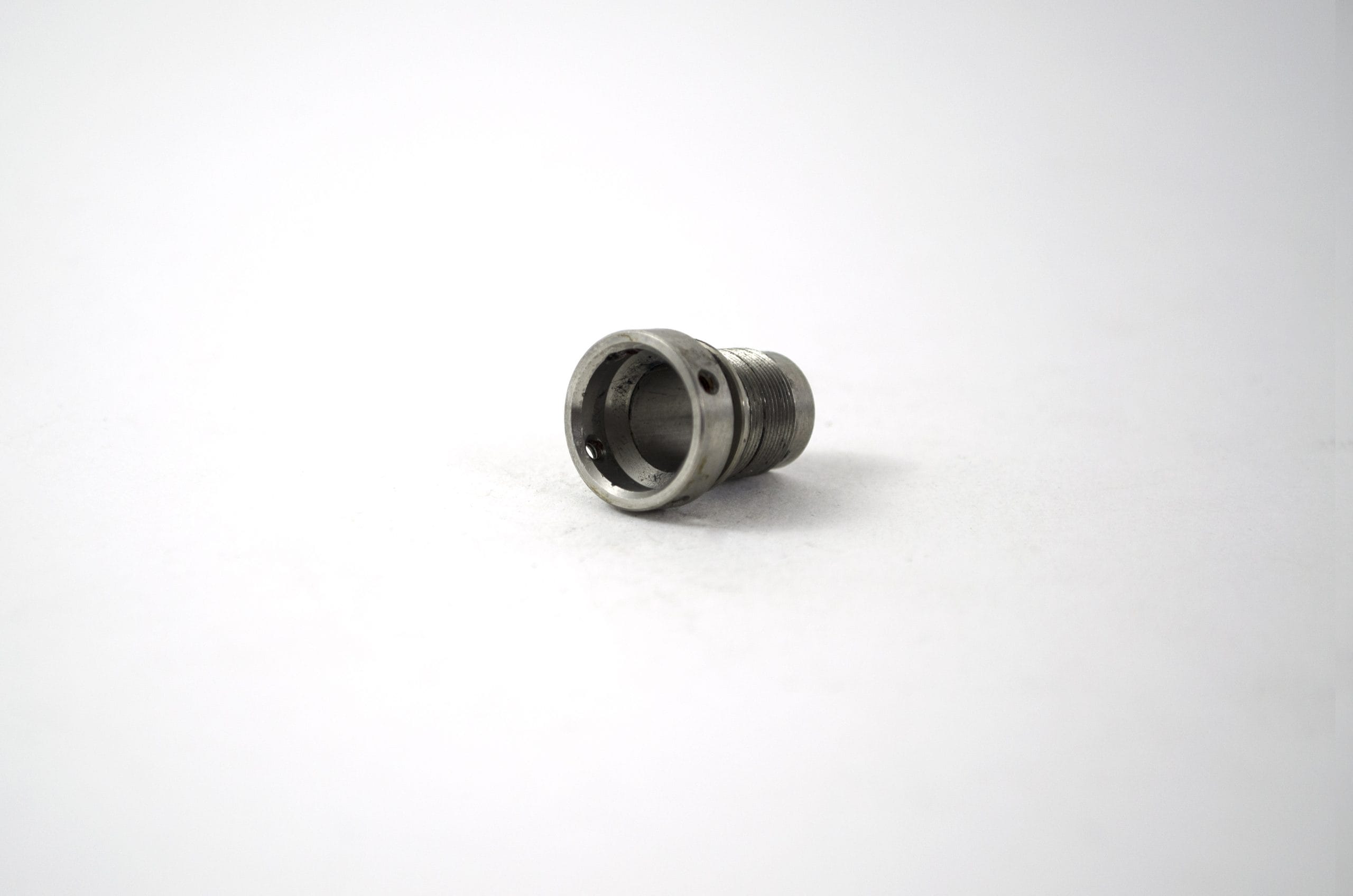Small Diameter Insertion Tube Connecting Ring. This part is screwed onto the metal Frame of the Small Diameter Upper Control Body Assembly. This part Guides Angulation Wires into the Small Diameter Insertion Tube. This part Serves As a Frame for the attachment of the Small Diameter Insertion Tube.