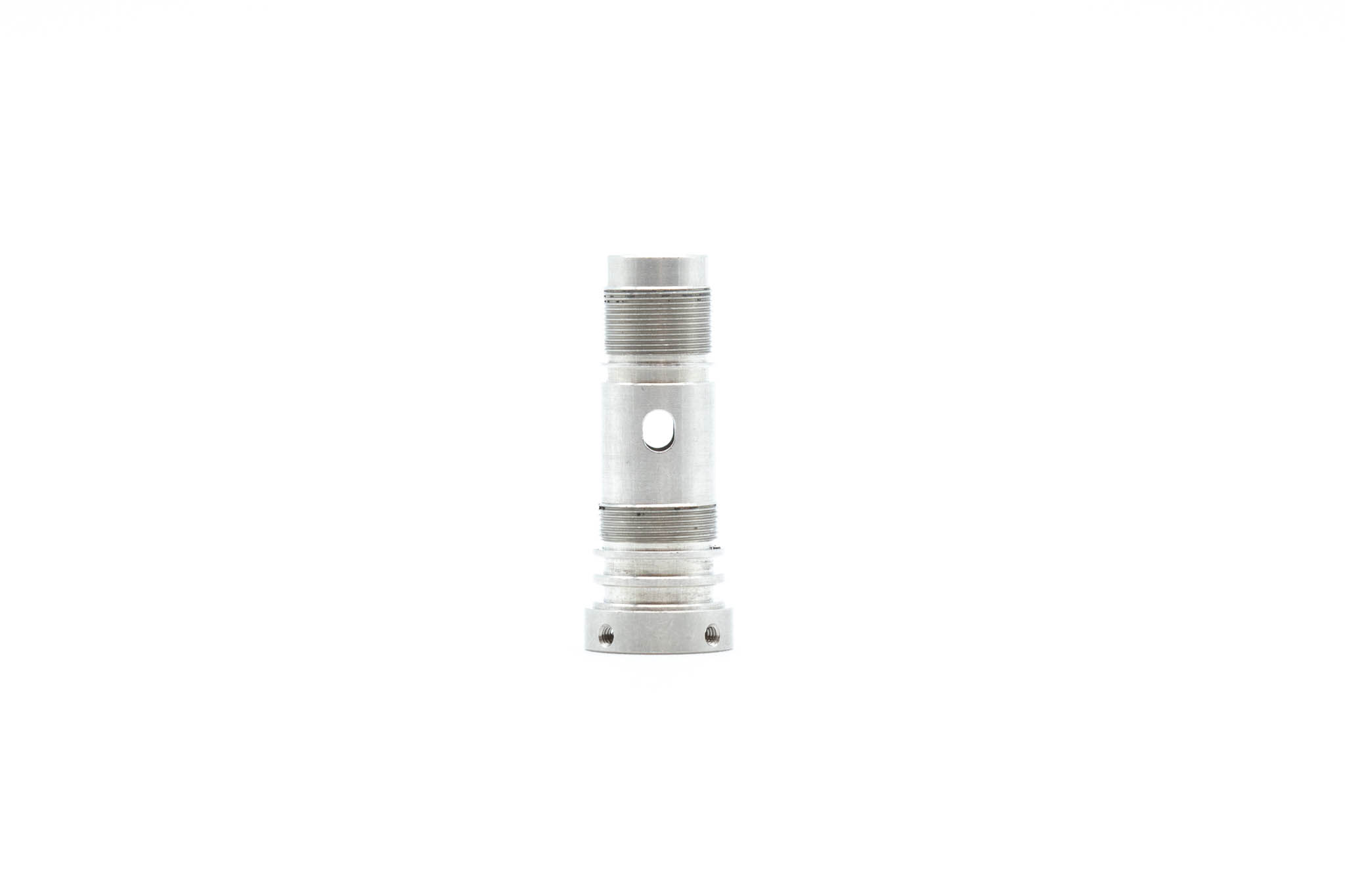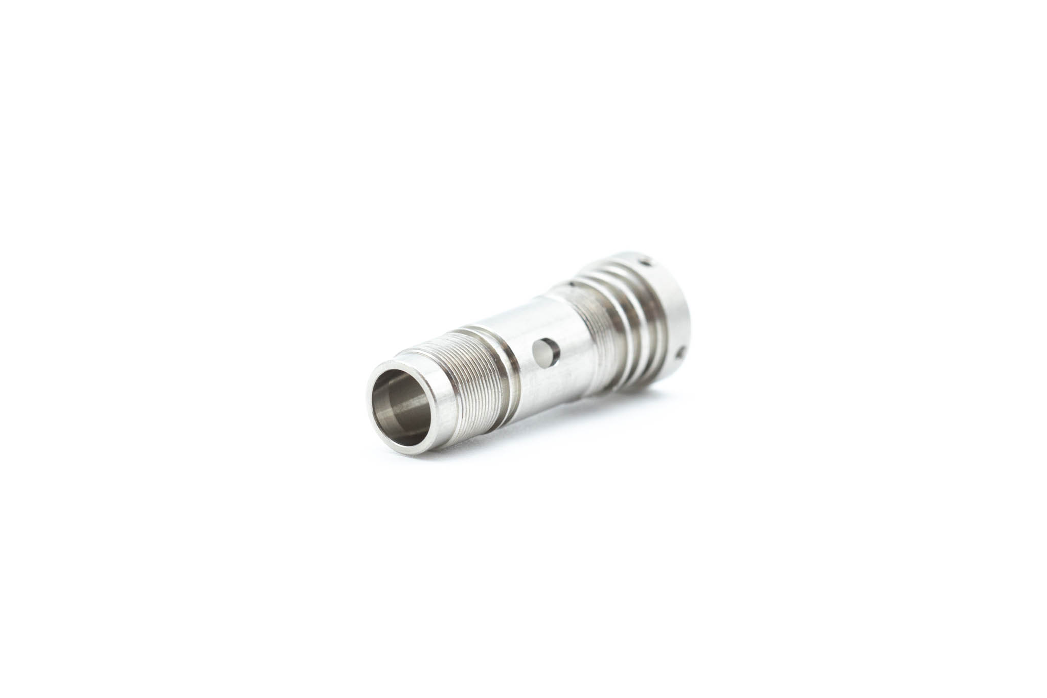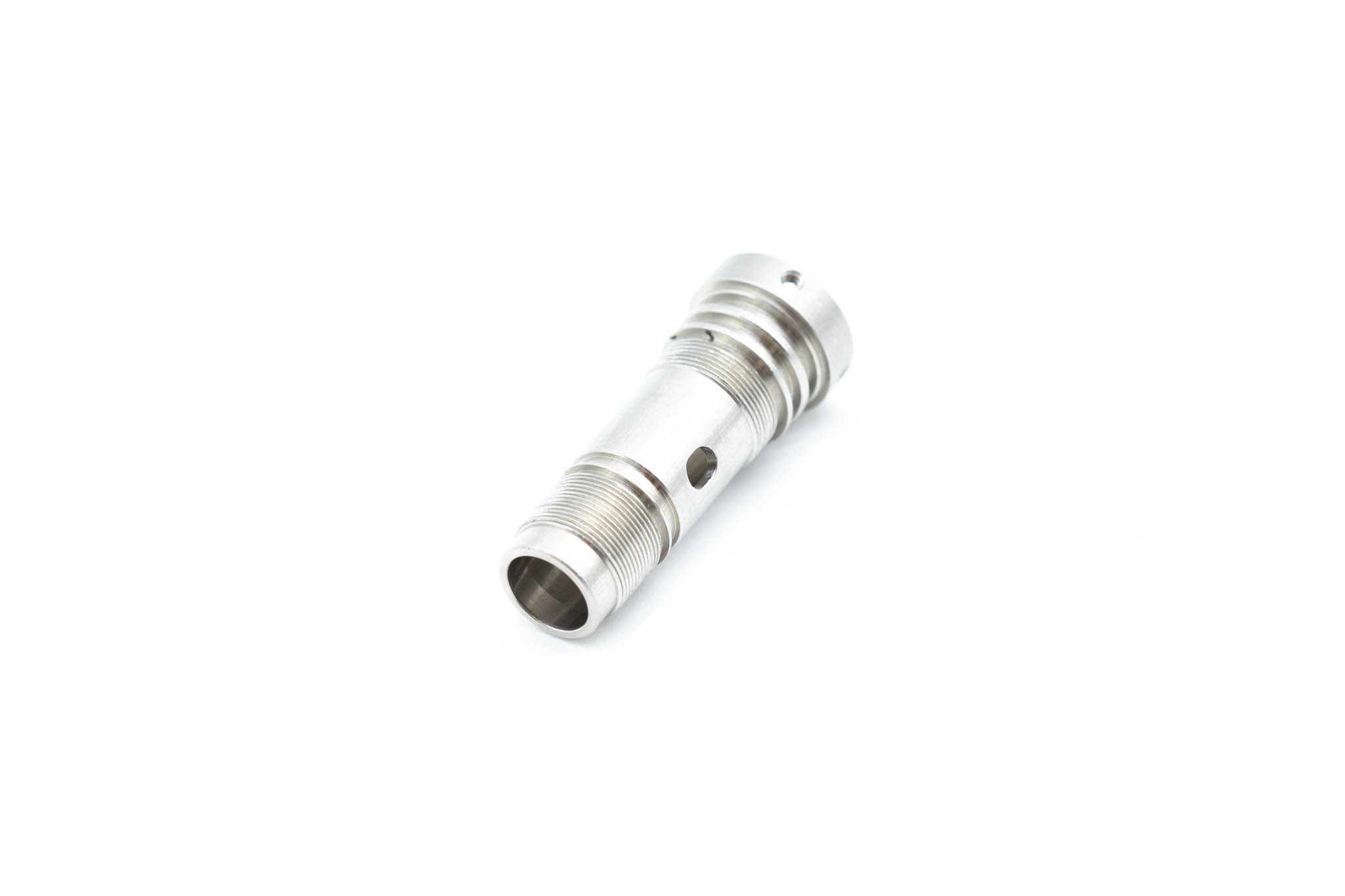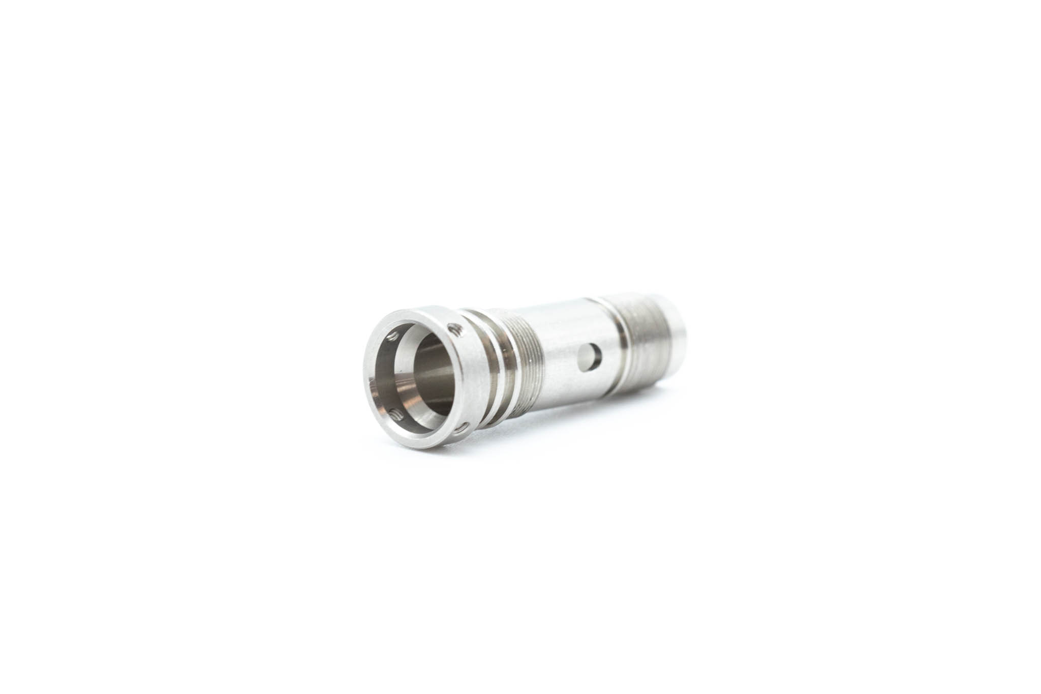 Small Diameter Insertion Tube Connecting Ring. This part is screwed onto the metal Frame of the Small Diameter Upper Control Body Assembly. This part Guides Angulation Wires into the Small Diameter Insertion Tube. This part Serves As a Frame for the attachment of the Small Diameter Insertion Tube.