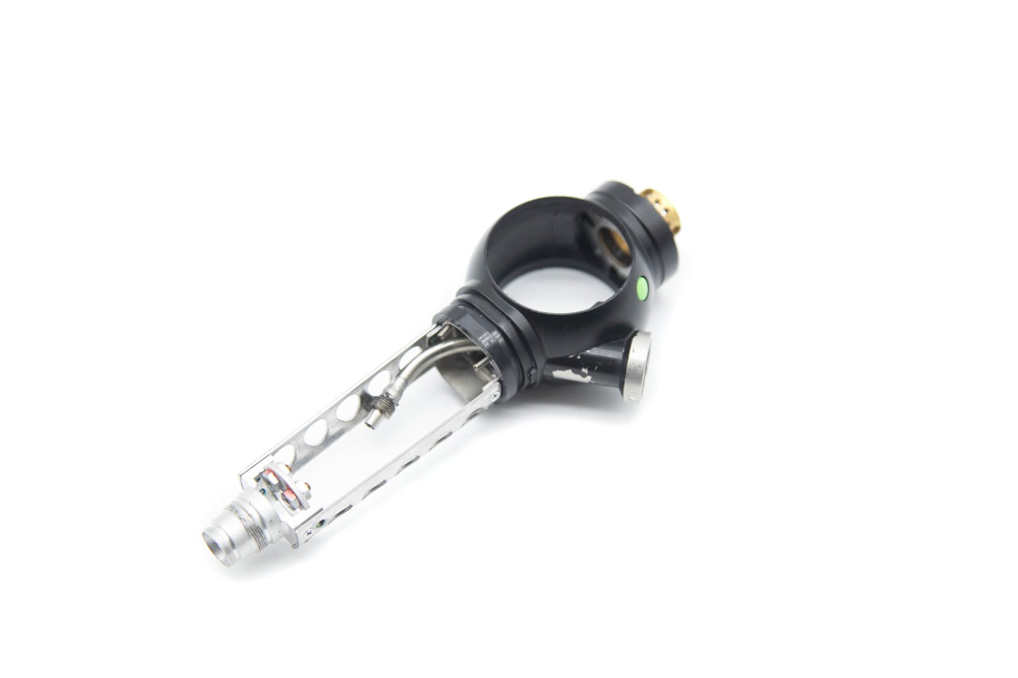Small Diameter Basic Upper Control Body Assembly. This part includes the Upper Control Body Housing, metal Eyepiece Mount (for Applicable Models), metal Port, Buttons/ Button Piston/Button Board (for Video Models), metal Brackets (for Applicable Models) and Angulation Disk. This part does not Include the Angulation Drum.
