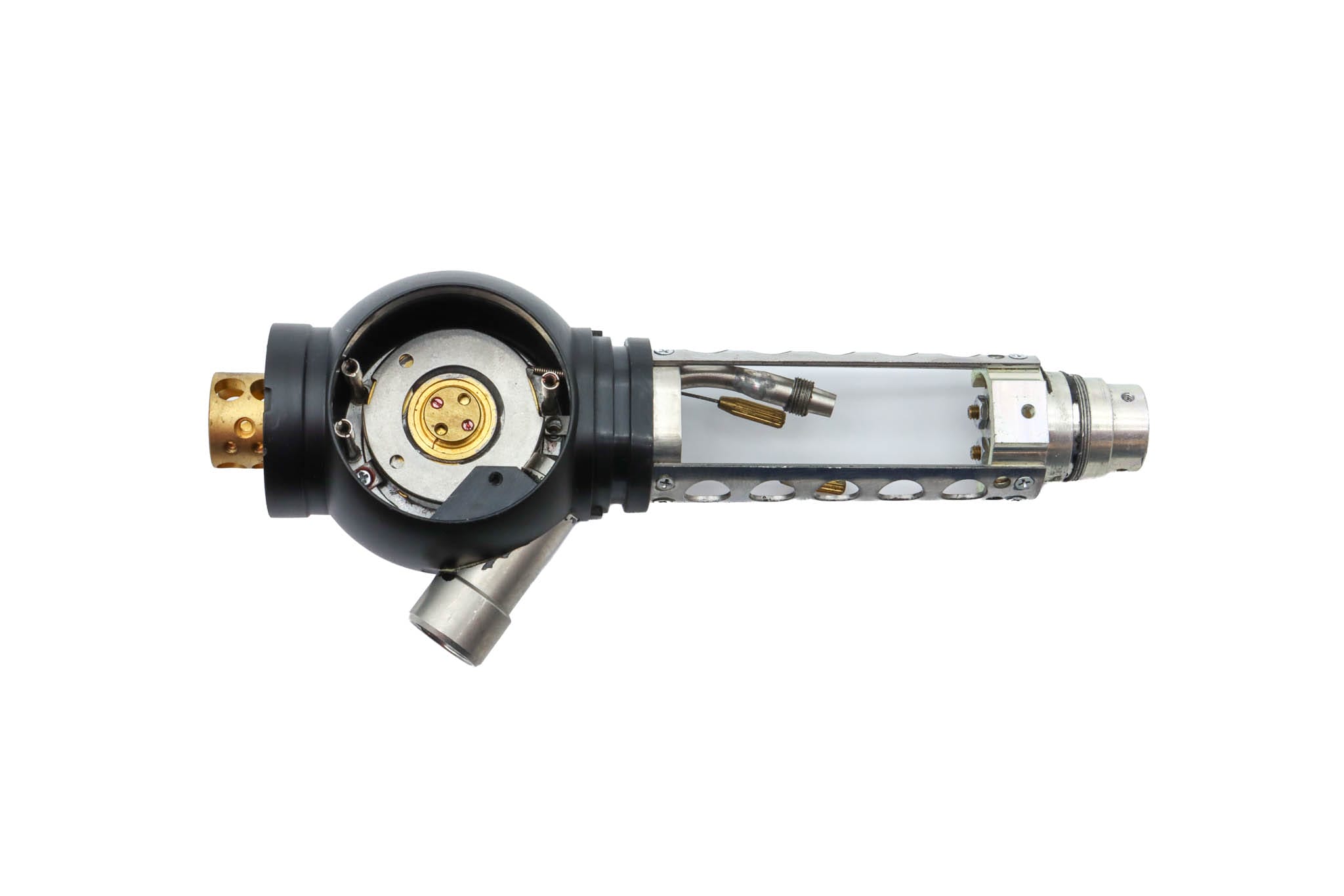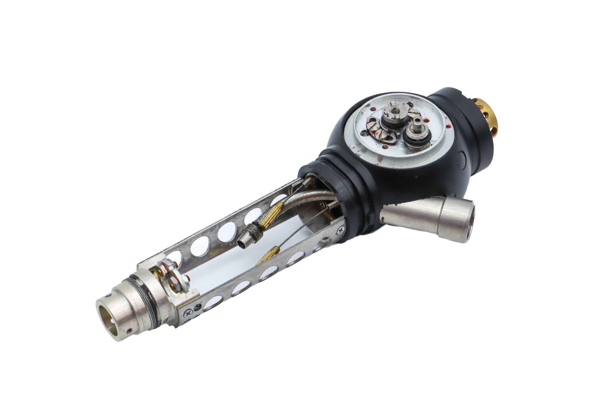 Small Diameter Basic Upper Control Body Assembly. This part includes the Upper Control Body Housing, metal Eyepiece Mount (for Applicable Models), metal Port, Buttons/ Button Piston/Button Board (for Video Models), metal Brackets (for Applicable Models) and Angulation Disk. This part does not Include the Angulation Drum.