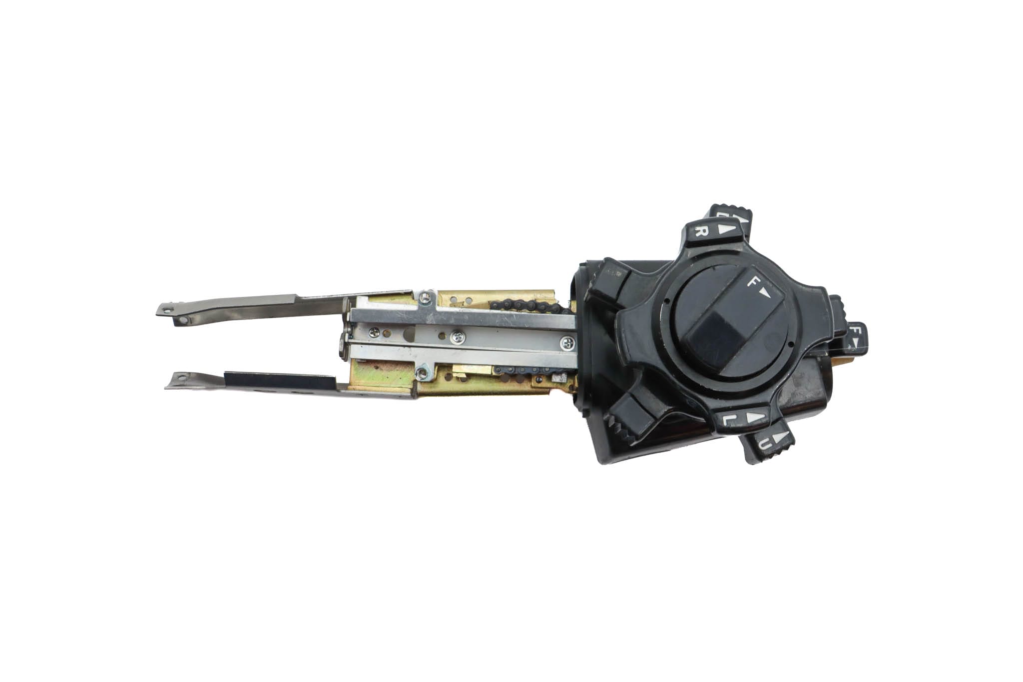 Upper Control Body Assembly. The assembly includes the following: plastic Upper Control Body Housing, metal base plate, white plastic chasis track, Angulation Assembly (Which includes Gears, Chains, Screws, and O-Rings), Up/Down Control Knob with Freeze Knob, Left/Right Control Knob, Freeze Knob Mount, Freeze Knob Mount Stopper, Freeze Knob Cover, and Freeze Control Knob. The Assembly has Never been Disassembled.