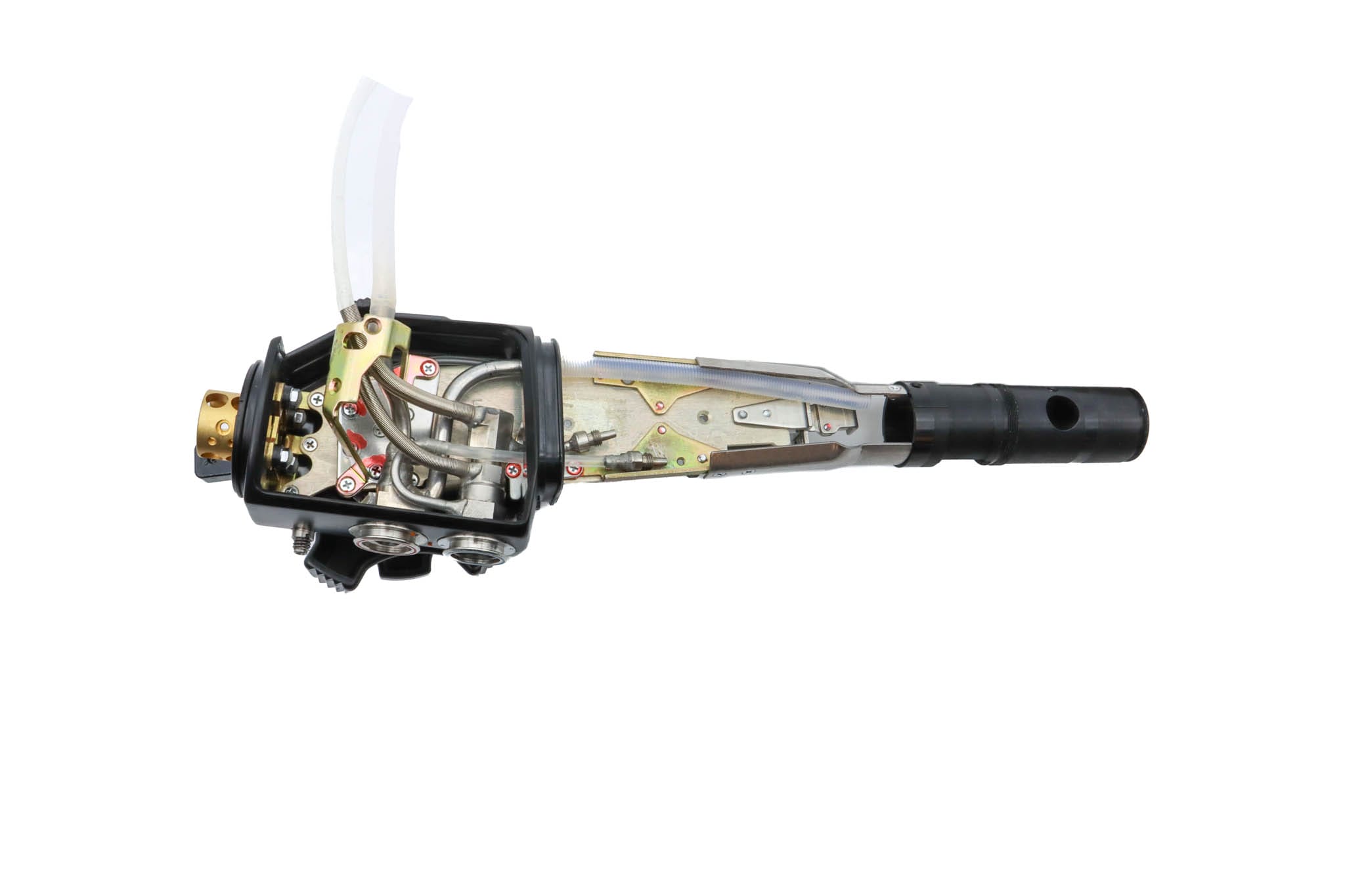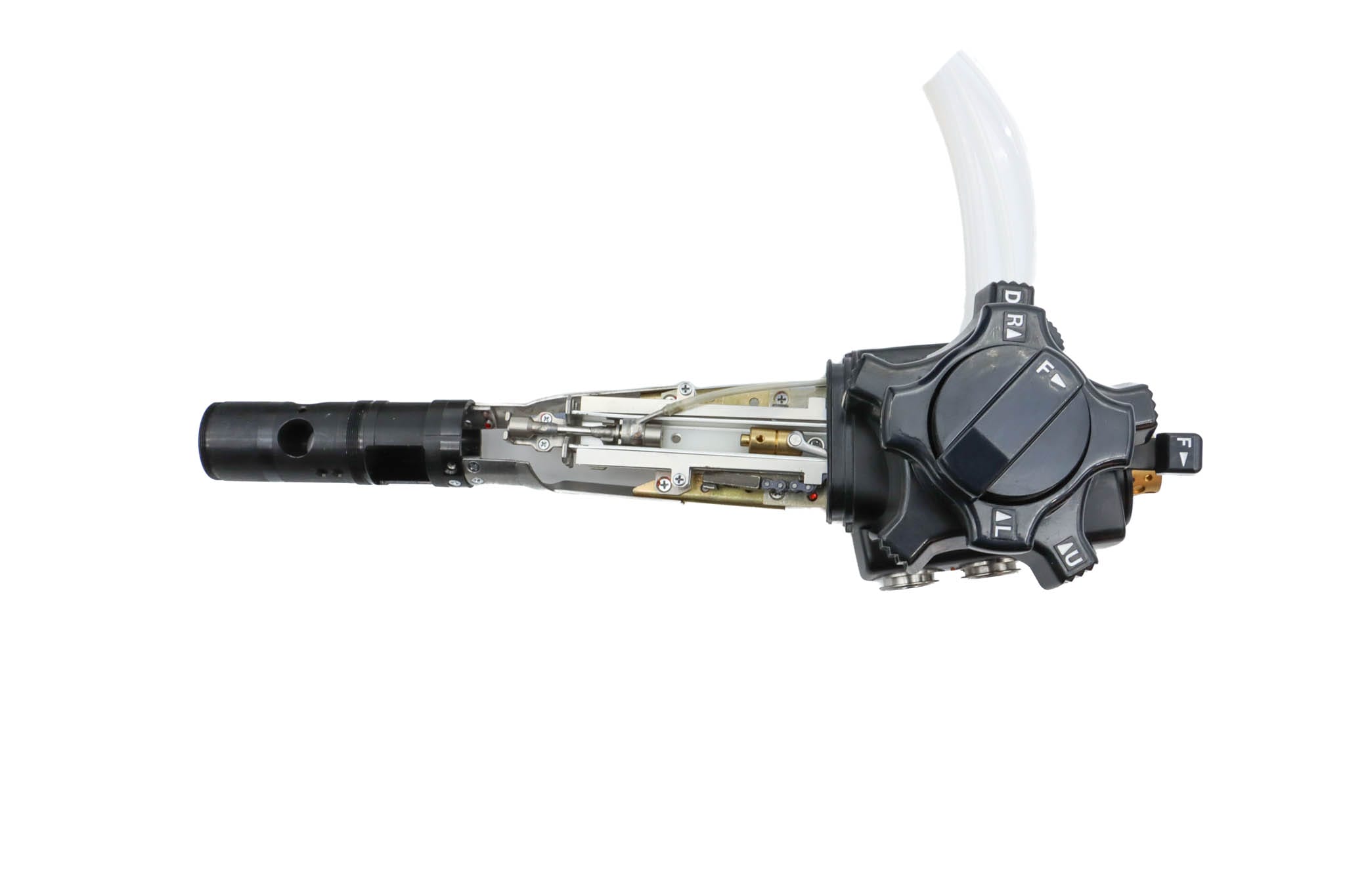 Upper Control Body Assembly. The assembly includes the following: plastic Upper Control Body Housing, metal base plate, white plastic chasis track, Angulation Assembly (Which includes Gears, Chains, Screws, and O-Rings), Up/Down Control Knob with Freeze Knob, Left/Right Control Knob, Freeze Knob Mount, Freeze Knob Mount Stopper, Freeze Knob Cover, and Freeze Control Knob. The Assembly has Never been Disassembled.