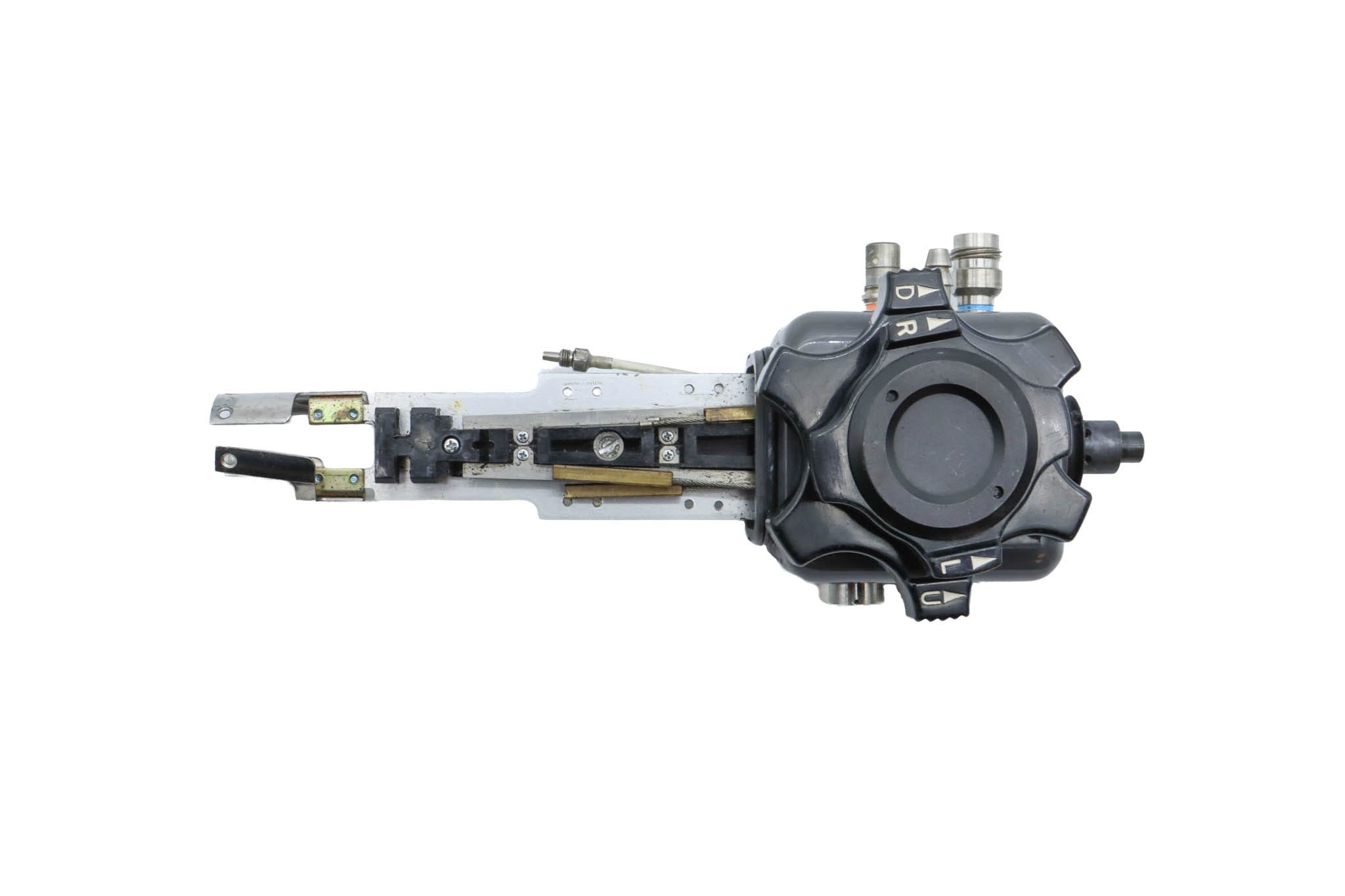 Upper Control Body Assembly. The assembly includes the following: plastic Upper Control Body Housing, metal base plate, white plastic chasis track, Angulation Assembly (Which includes Gears, Chains, Screws, and O-Rings), Up/Down Control Knob with Freeze Knob, Left/Right Control Knob, Freeze Knob Mount, Freeze Knob Mount Stopper, Freeze Knob Cover, and Freeze Control Knob. The Assembly has Never been Disassembled.