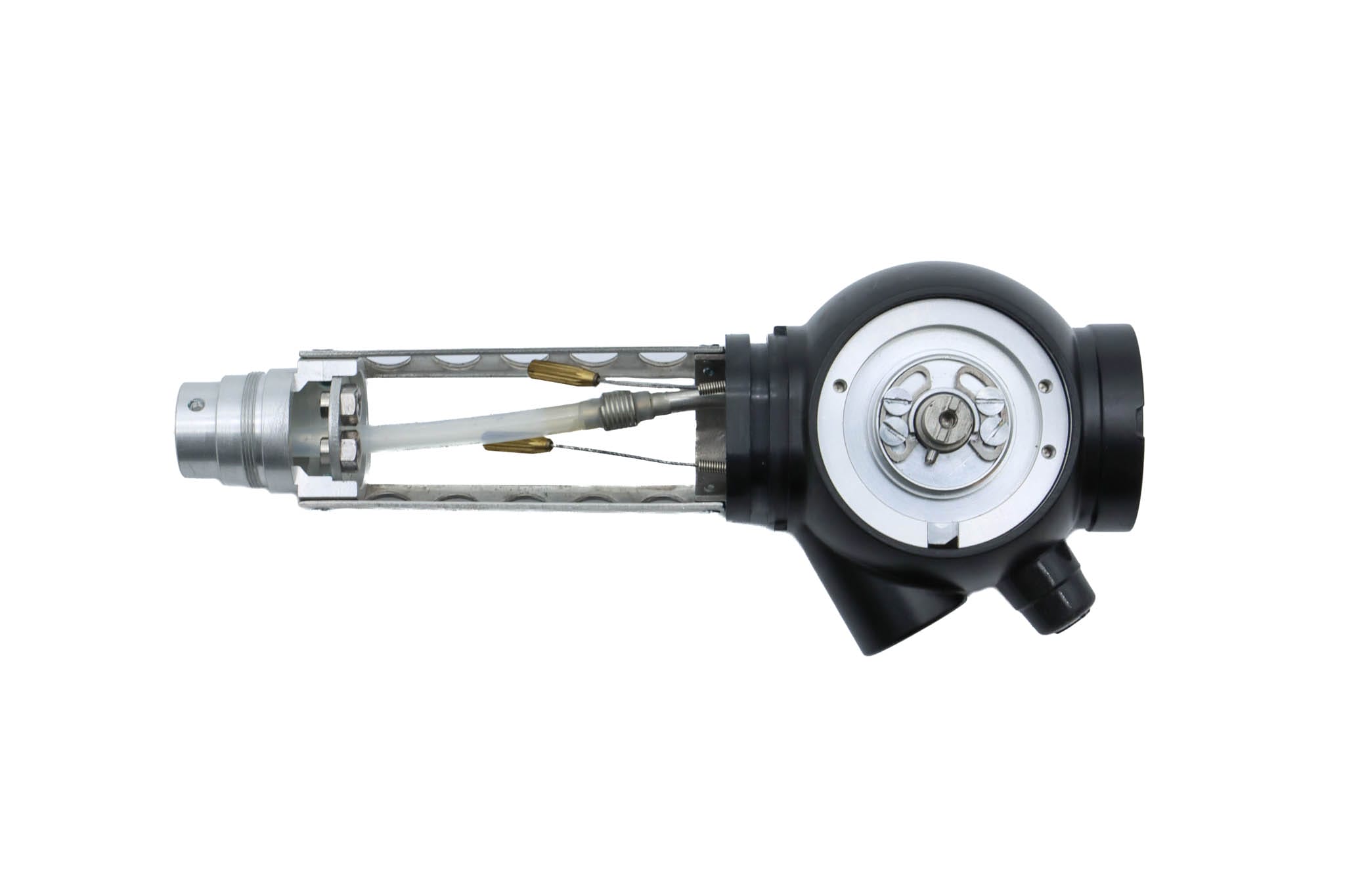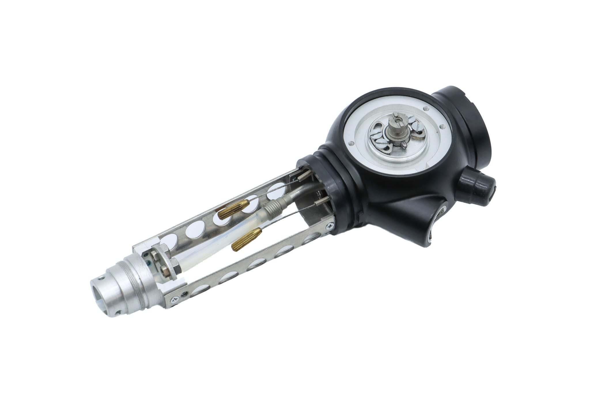 Small Diameter Basic Upper Control Body Assembly. This part includes the Upper Control Body Housing, metal Eyepiece Mount (for Applicable Models), metal Port, Buttons/ Button Piston/Button Board (for Video Models), metal Brackets (for Applicable Models) and Angulation Disk. This part does not Include the Angulation Drum.