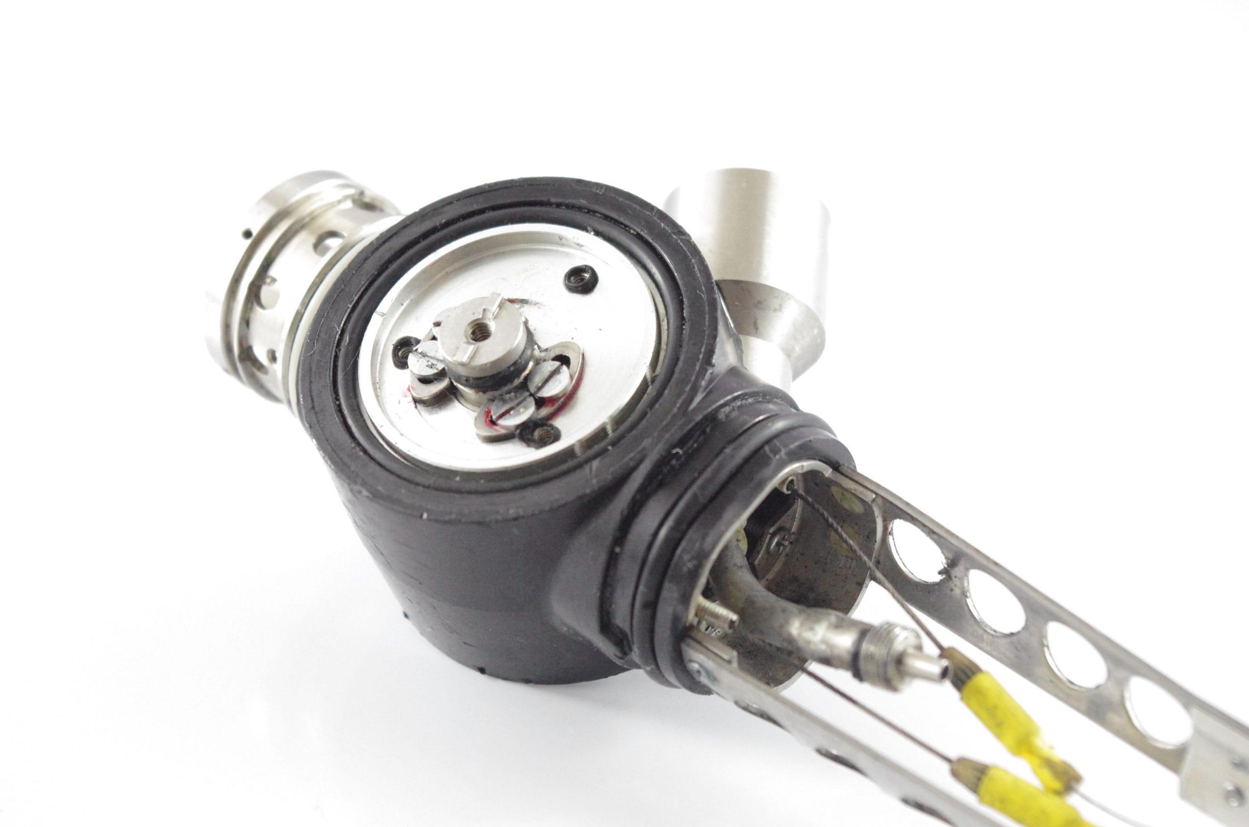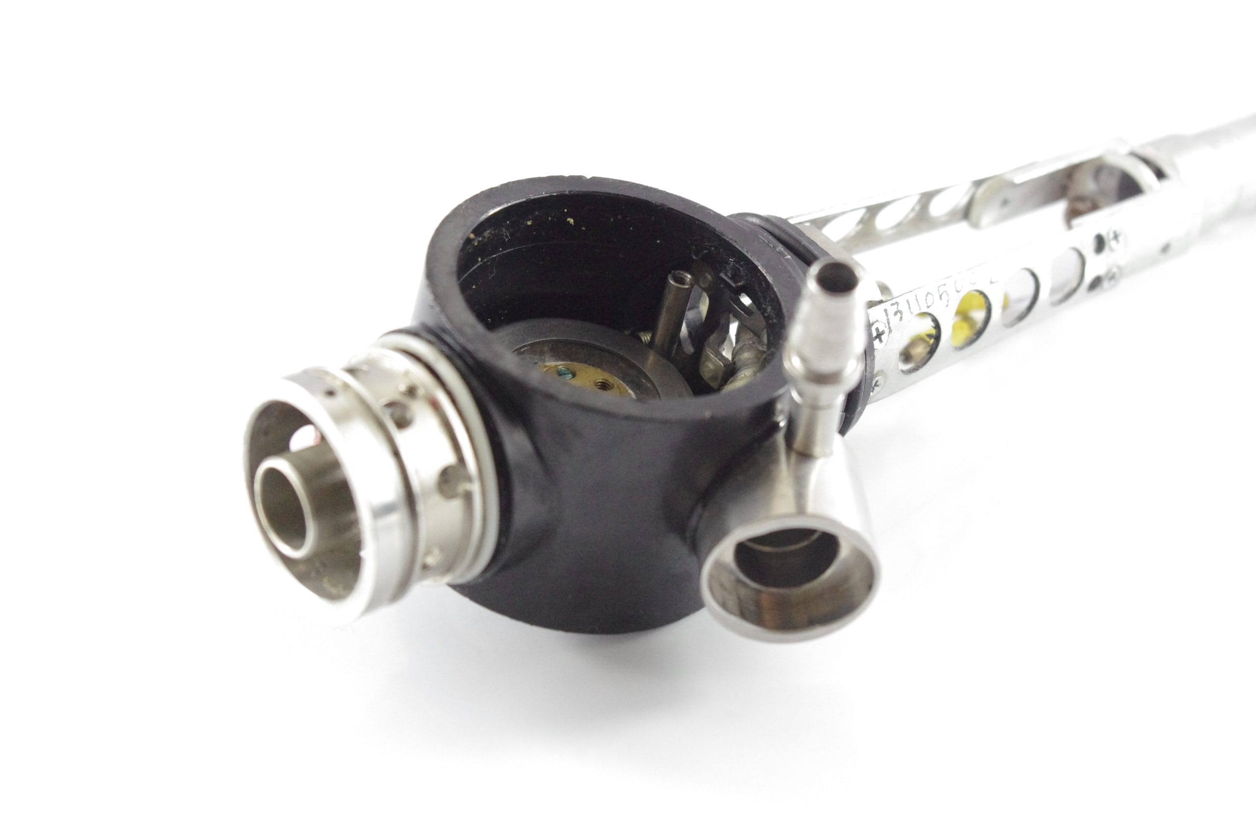Small Diameter Basic Upper Control Body Assembly. This part includes the Upper Control Body Housing, metal Eyepiece Mount (for Applicable Models), metal Port, Buttons/ Button Piston/Button Board (for Video Models), metal Brackets (for Applicable Models) and Angulation Disk. This part does not Include the Angulation Drum.