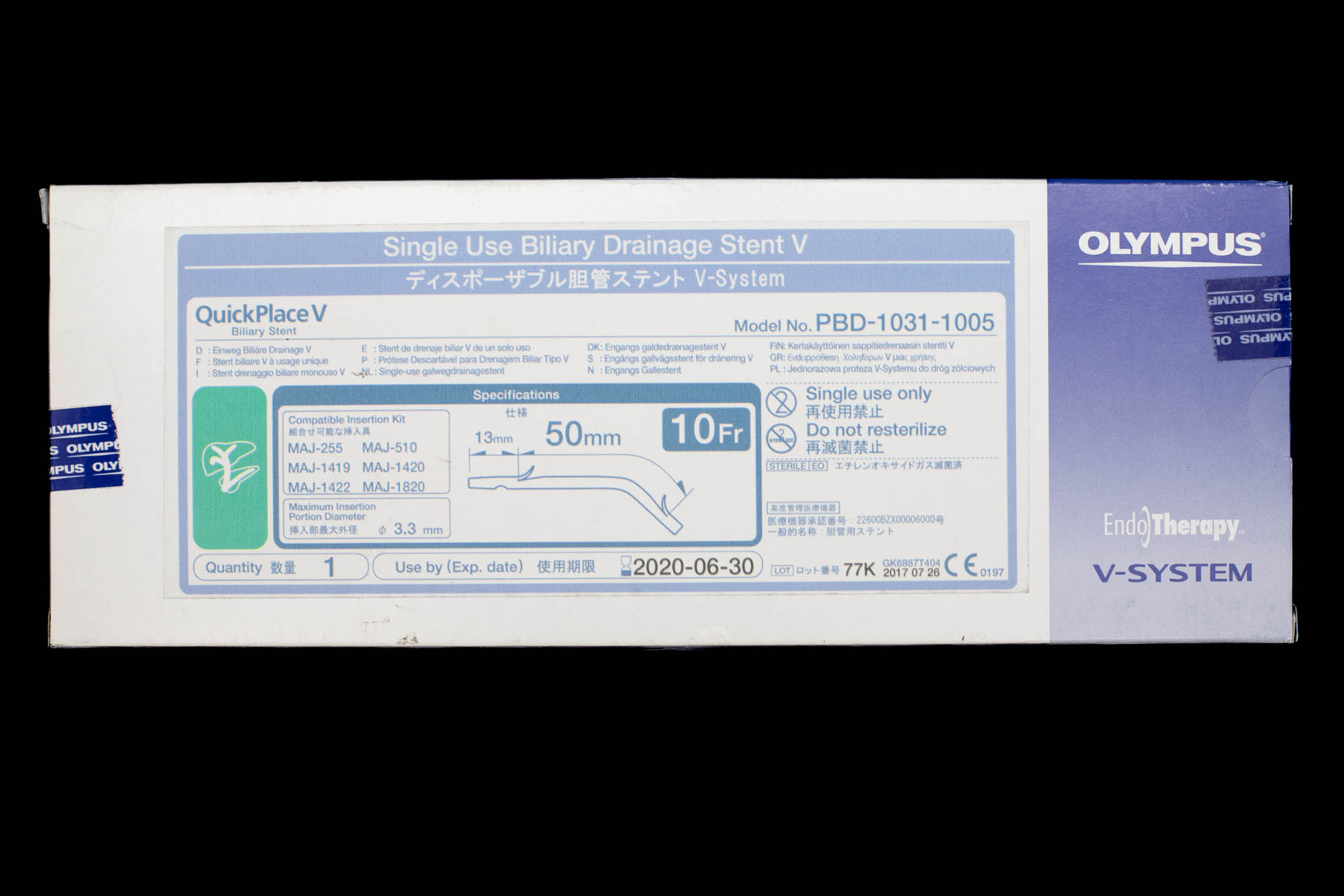 [Out-of-Date] Disposable Biliary Drainage Stent V, QuickPlace V, 10 Fr, 13 mm Tip Length, 50 mm Body Length, Curved, 3.3 mm Max. Insertion Portion DIA - PBD-1031-1005 [1/Box]